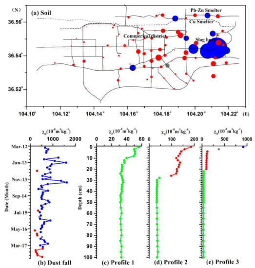 Seasonal variations are evident in the atmospheric dustfall measurements, suggesting that industrial emissions by factory chimneys and blowing dust from slag heaps and mineral transport control its magnetic properties, and that, furthermore, coal burning in winter is not the dominate source. Since the smelter plant ceased to operate at full capacity since 2014, the dominant source of atmospheric dustfall changed from fly ash emissions by factory chimneys and mineral dust to blowing dust from slag heaps. Governance of slag pollution is then a major task in resource-exhausted urban areas. In conclusion, combined magnetic measurements of multiple environmental carriers, such as soil and atmospheric dustfall, provide accurate, integrated, and detailed pollution proxies to highlight temporal and spatial scale variations in pollution sources.