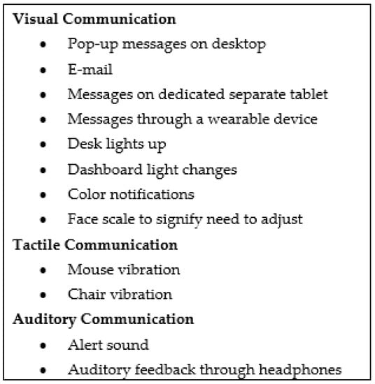 - If not mentioned or respondents need examples, ideas mention: phone notification, pop-up on the computer screen; vibration/buzzer on the desk; blinking lights on the desk; notifications on a different dedicated screen placed on the desk (like a tablet); a virtual agent who you can talk to that might appear on multiple mediums (e.g., computer monitor, phone, computer, tablet).