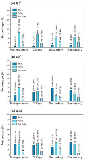 Comparison of response percentages among educational groups: (A) Question 7; (B) Question 8; (C) Question 13. ** Chi-square values significant at p < 0.01.