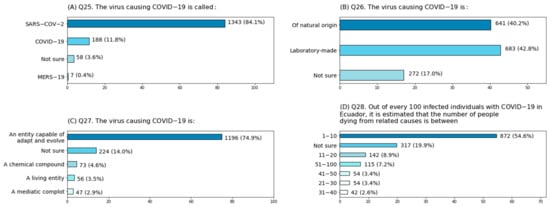 People’s adherence to prevention and control campaigns is known to be influenced by their knowledge, attitudes and practices as regards COVID-19 [,]. Common misunderstandings, with regards to the treatments, transmission, prevention, characteristics and origin of the virus, circulate frequently on social media, and such misinformation could undoubtedly contribute to the overall impact of the pandemic on the public []. In Ecuador, for instance, important misunderstandings have been disseminated in such a way, including misconceptions regarding the development of vaccines, viral mutations, the origin of the virus or the use of sea water as a potential treatment [,]. Multiple reports have focused on assessing the knowledge, attitudes and practices among individuals of different communities [,,,]. These investigations have all made use of a similar survey that focuses on determining knowledge about symptoms, transmission and prevention. These reports have thus recommended the expansion of the questionnaire in order to get a better understanding of people’s knowledge about the biology of the virus, along with their assessment of traditional and unproven treatments. In this investigation, we adapted the aforementioned form to the national context and included supplementary queries dealing with the virus characteristics, its detection and treatments. Studies assessing the knowledge of contagious diseases provide reference information that could be useful to define the type of measures required to change misconceptions about the related pathogens. The data gathered by these investigations would be helpful for providing better insights, and so address deficient knowledge about diseases. In addition, this information could be applied for developing preventive strategies and promoting health programs.
