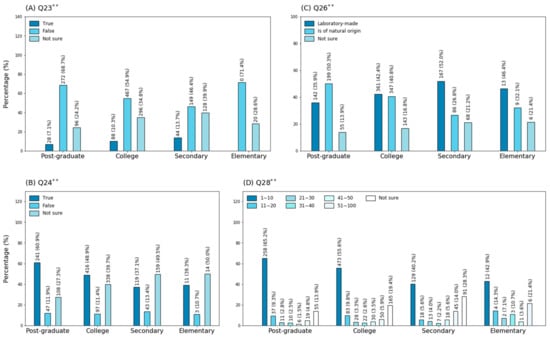 Comparison of response percentages among educational group: (A) Question 23; (B) Question 24; (C) Question 26; (D) Question 28. ** Chi-square values significant at p < 0.01.