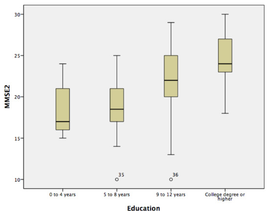 Another ANCOVA was performed, this one on the estimated MMSE-2 scores and with years of education as the independent variable and age as a covariate. The means and SDs are in Table 2. Data are the adjusted mean ± SE, unless otherwise stated. The MMSE-2 scores were greater in participants with a level of education reaching from college through a higher degree (13±) (24.48 ± 0.43) compared to individuals with 9 to 12 years of education (21.76 ± 0.41), 5 to 8 years of education (18.79 ± 0.94) or 0 to 4 years of education (18.72 ± 1.58). The more years of education a person had, the better his or her score on the MMSE-2 was, as previous literature has documented [10,11,12]. Figure 2 shows the distribution of the MMSE-2 scores across years of education.