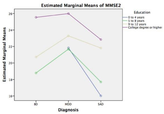 For a psychiatric patient, having a high level of education appears to improve the MMSE-2 scores. Contrary to expectations, this association did not hold true with SAD patients. The members of this group had lower scores than the BD and MDD patients did. Compared to the other two groups, the SAD patients were found to have worse cognitive functioning when we used a cutoff of 23, independently of education. That is significant information.