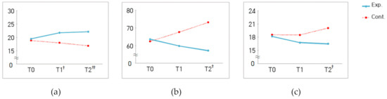 | T2 | 16.50 ± 5.18 | 20.11 ± 6.46 | Group-by -time interaction | 9.60 | 0.008 † | ||
