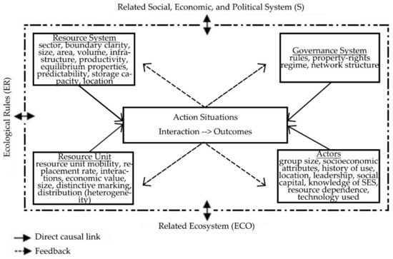 The IAD framework, however, is criticized as it lacks in terms of diversity and complexity of natural system and processes [7]. Therefore, SES is an improved version building upon the IAD framework by expanding the basic variables into more relevant categories, as shown in Figure 1. The SES framework provides a more detailed variable oriented analysis of the social–ecological system [7]. According to Partelow, SES is “a conceptual framework providing a list of variables that may be interacting and affecting outcomes in social-ecological systems” [9]. Via the identified SES attributes, consistent with the application spirit of IAD, we are able to diagnose and explain the interaction (activities) and the outcome of a situation. The community and governance attributes in the IAD context have been maintained as social and governance systems in an SES, while biophysical/ecological attributes converge into two sections, namely, resource systems and resource units. SES, normally applied in the context of commons governance [10], is proven to be versatile and adaptable due to its generality (see the complex adaptive system [11]). It also enables a comparison of different settings in a study where data are collected with the means to compare [9].
