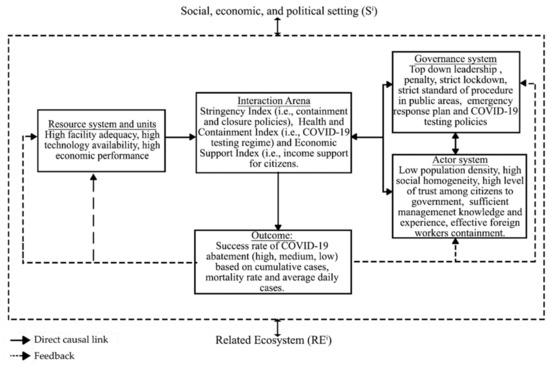 As of June 2020, there were countries that had successfully mitigated the problem, while some were struggling and had failed due to countless reasons. Much emphasis has been focused on the science and pharmaceutical dimensions in effort to produce vaccines to cure the pandemic, although it is believed that social behaviors and other potential non-pharmaceutical approaches, despite being intangible, indirect, and leaning towards prosociality (i.e., collective interest) via a cooperative action, can also contribute to curbing the pandemic [5]. Utilizing this research, we carried out an integration between health and the systemic institutional–social–ecological system (SES) framework, apart from knowing its relevancy when applied outside its commons domain, in order to specifically identify answers to the following research question: How can the diagnostic Institutional Analysis and Development (IAD)–SES framework help answer the level of success or failure of countries in curbing the pandemic? It has come to attention that there is a noticeable gap of research in exploring what and how institutional–social–ecological dimensions of the Institutional Analysis and Development (IAD) or SES framework help in understanding the unprecedented crisis. More precisely, given the numerous exogenous factors, this study identifies which SES attributes (design principles) are significant and effective in explaining and thus curbing the pandemic. The framework, synonymous with commons and resource management or collective action, is rarely applied to a health and disease-related topic such as COVID-19; therefore, relationships between the transmission risk or severity of COVID-19 and socio-economic and environmental factors via the SES lens should be explored in order to devise a holistic strategy in mitigating the pandemic.