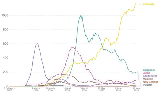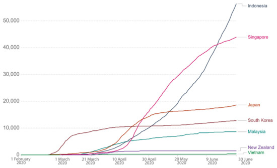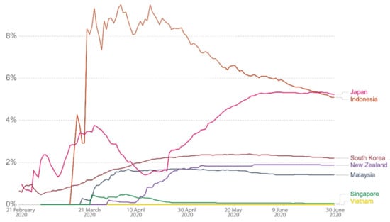 New Zealand and Vietnam recorded the highest stringency score at 96, followed by South Korea at 82, Indonesia at 80, Singapore at 76, Malaysia at 75, and Japan at 47 [18]. High stringency, composed of indicators such as school and workplace closure, public events or gathering restriction, and international and domestic travel controls, reflects governments’ strict policy emphasizing effective monitoring. In terms of the results, New Zealand and Vietnam were labelled as high, while Japan was considered low. Other countries such as Singapore, South Korea, Indonesia, and Malaysia were considered medium.