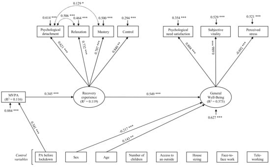 Structural equation modeling of the relations between physical activity, recovery experiences, and general well-being for all participants. Note. Completely standardized maximum likelihood parameter estimates. Solid lines indicate significant paths. Non-significant paths are not displayed. *** p < 0.001. ** p < 0.01. * p < 0.05.