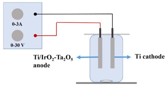 Therefore, it can be concluded that the indirect oxidation reaction represented by Equations (3) and (4) occurred on the surface of the dimension stable anode electrode during electrolysis. MOx represents the metal oxide coating of the Ti/IrO2-Ta2O5 electrode.