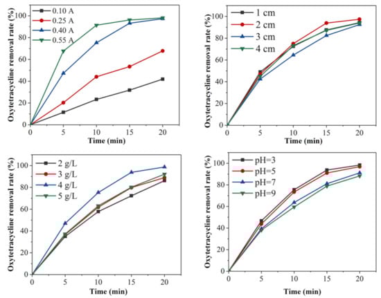 The current intensity affects the transfer rate of the electrons between the electrode and the solution, but a larger current incurs greater energy consumption, so it is important to choose a current that achieves good removal efficiency together with low energy consumption. To explore the effect of the current intensity on the removal of oxytetracycline, experiments were carried out by changing the current intensity (0.100, 0.250, 0.400, 0.550 A), while other conditions (plate spacing: 2 cm, Na2SO4 electrolyte concentration: 4 g/L, solution pH: 3) remained unchanged. As shown in Figure 2, for the current values of 0.1 and 0.25 A, the removal rate of oxytetracycline was 41.9 and 67.8% at 20 min, respectively, and for a current of 0.55 A, the removal rate of oxytetracycline reached 97.39% at 20 min. Thus, the removal rate of oxytetracycline in solution increased with increasing electric current. When the current increased, the electron transfer rate between the electrode and solution increased, and with an increased electron transfer, a large number of strongly oxidizing hydroxyl radicals were produced. Hydroxyl radicals with strong oxidizing ability react with oxytetracycline, and the removal rate of oxytetracycline increases accordingly []. The current intensity influences the generation rate of strong oxidizing radicals required for indirect oxidation reactions and the oxidation rate of organic matter on the electrode surface during direct reactions. When the current was too small, not enough highly oxidizing free radicals were produced to break the chemical bonds of oxytetracycline; thus, oxytetracycline had a low removal rate with little change in solution. According to the removal trend of oxytetracycline hydrochloride after electrolysis for 15 min in Figure 2, the removal effects of 0.400 and 0.550 A on oxytetracycline hydrochloride were not significantly different. Considering energy consumption, it was more reasonable to choose 0.4 A with a removal rate of 97.39%.