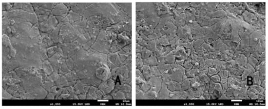 SEM of the Ti/IrO2-Ta2O5 electrode: (A) before use at 10 μm and (B) after use at 10 μm.