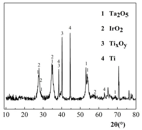 As shown in Figure 5, the diffraction peaks of Ta2O5 (JCPDS 97-028-0397), IrO2 (JCPDS 97-008-4577), Ti (JCPDS 00-005-0682), and Ti oxide (JCPDS 97-000-0926 97-000-9646 97-000-0932) were observed in the XRD characterization results of the Ti/IrO2-Ta2O5 electrode. The diffraction peaks of Ta2O5 and IrO2 indicated that the coating material was fixed on the surface of the plate. The diffraction peaks of Ti and Ti oxides were due to the small cracks caused by the thermal stress between the different substances of the plate coating material. The prepared Ti/IrO2-Ta2O5 anode met the test requirements.