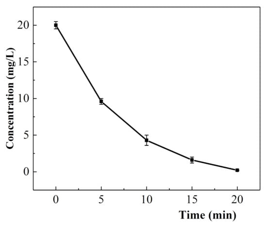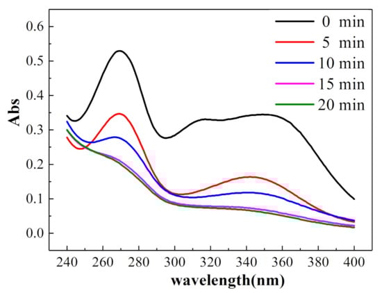 In Figure 9, the UV–Vis absorption spectra of 20 mg/L oxytetracycline solution after electrolysis for 0, 5, 10, 15, and 20 min under the optimal experimental conditions are shown with the progress of the electrolysis reaction, the absorption intensities of the peaks near 275 and 355 nm gradually weakened, and the intensity of the peak at 275 nm decreased strongly. It is speculated that some functional groups were destroyed due to the action of hydroxyl radicals. Furthermore, it is speculated that the hydroxyl group on carbon No. 10 of oxytetracycline HCl was easily oxidized to form C=O bonds in a strong oxidizing system; thus, the acidity decreased. However, after 20 min of electrolysis, the UV absorption peaks of the two functional groups were still present, indicating that only a part of the structure of the two functional groups was damaged.