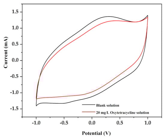 Figure 7 shows the cyclic voltammetry curves of the Ti/IrO2-Ta2O5 electrode in a blank solution (Na2SO4 solution) and a 20 mg/L oxytetracycline solution. The cyclic voltammetry (CV) curve of the 20 mg/L oxytetracycline solution had the same shape as the CV curve of the blank solution, and no new peaks were found, indicating that there was no direct electron transfer on the Ti/IrO2-Ta2O5 electrode. The electrochemical oxidation of organic matter on the anode surface was divided into direct oxidation and indirect oxidation. The absence of a new peak of the anode current during the forward scan implied that the oxidation reaction did not directly occur on the anode surface, and the degradation of organic matter was mainly carried out through indirect oxidation []. Therefore, in this experiment, oxytetracycline was not oxidized directly on the anode surface but rather was decomposed by the active substances (such as •OH) in the solution.