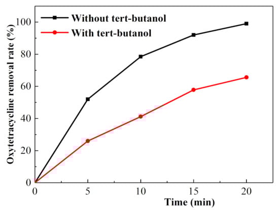 Under the optimal experimental conditions, the removal comparison curve of the oxytetracycline solution without tert-butanol and the oxytetracycline solution with a tert-butanol concentration of 30 mg/L is shown in Figure 8. The removal rate of oxytetracycline solution with tert-butanol was lower than that of the oxytetracycline solution without tert-butanol, and the removal rates of the oxytetracycline solution without tert-butanol and the oxytetracycline solution with tert-butanol were 93.74 and 59.30%, respectively, after 20 min of electrochemical treatment with a 20 mg/L oxytetracycline solution. The addition of tert-butanol had a clear inhibitory effect on the removal of oxytetracycline. Therefore, the oxytetracycline removal process was related to •OH. Thus, a large amount of •OH was produced in the electrolysis process that could effectively destroy the oxytetracycline structure.