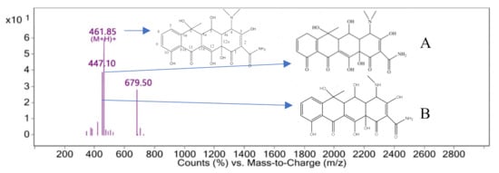 The characteristic peak retention time of 3.892 min was obtained by mass spectrometry in the mass–charge ratio range of 0–2800, as shown in Figure 10. The mass–charge ratio M/Z of 461.85[M+H]+ was assigned to oxytetracycline (the remaining oxytetracycline molecules present in the solution), as shown in Figure 10. Since the concentration of oxytetracycline was very low after 20 min of electrolysis, the ultraviolet absorption peak at 275 nm was significantly reduced, and the pH of the solution decreased, it is speculated that this characteristic peak was more likely to be compound 1 generated by the oxidation of the hydroxyl group on carbon No. 10 to the C=O bond, as shown in Figure 10A. The substance with an M/Z of 447.10 was 14 atomic masses less than M/Z 461.85[M+H]+, and it is hypothesized that this result was due to the replacement of the methyl group of the dimethylamino on carbon No. 4 by hydrogen to obtain compound 2, as shown in Figure 10B.