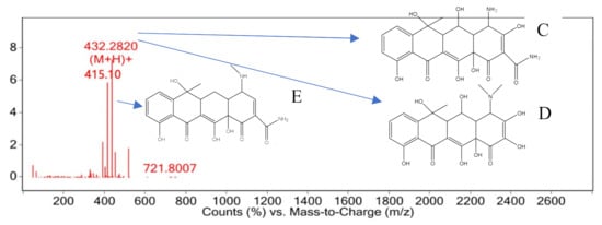 The characteristic peak retention time of 6.021 min was determined by mass spectrometry in the mass–charge ratio range of 0–2600, as shown in Figure 11. The M/Z of 432.28[M+H]+ that may not be well matched to M/Z 433 or M/Z 434 is hypothesized based on the formation process of compound 2 and the structural formula of oxytetracycline. The methyl group on dimethylamine at carbon No. 4 was easily replaced by hydrogen to form compound 2. If both methyl groups were replaced, a substance with an M/Z of 433 may be obtained, namely, compound 3, as shown in Figure 11C. The substance with an M/Z of 434 may be compound 4 with a molecular weight of 434 that is speculated to be formed by amide bond fracture on carbon No. 2 and hydroxyl radical combination; its structure is shown in Figure 11D. The substance with an M/Z of 415.10 may be based on compound 2, with one hydroxyl group removed from carbon No. 3 and carbon No. 5 to obtain compound 5, as shown in Figure 11E.
