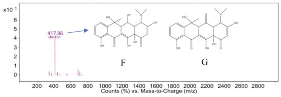 The characteristic peak retention time of 3.162 min was analyzed by mass spectrometry in the mass–charge ratio range of 0–2800, as shown in Figure 12. The M/Z of 417.96[M+H]+ that may correspond to compound 6 with a molecular weight of 417 and its molecular weight differed by 16 from that of compound 3 with a molecular weight of 433. It is speculated that the carbon No. 2 of oxytetracycline did not bind hydroxyl radicals but was reduced to compound 6, as shown in Figure 12F. Compound 6 was easily oxidized as the hydroxyl group on carbon No. 5 may be oxidized to a carbonyl, resulting in compound 7 with a molecular weight of 415. Furthermore, it may be another substance from Figure 11 with an M/Z of 415.10, and its structure is shown in Figure 12G.