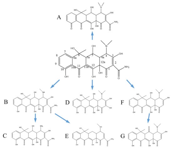 Diagram of degradation process of oxytetracycline. (A–G) were the compounds produced by the degradation process, respectively.