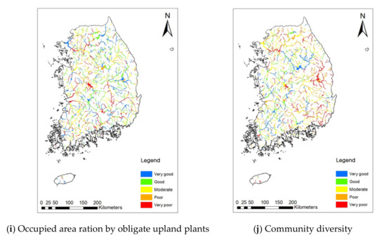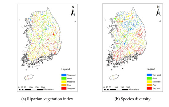 In a map based on species diversity, reaches evaluated as “very good” and “good” grades were usually distributed in the northern and eastern parts, whereas reaches evaluated as “very poor” and “poor” grades were in the southern and western parts. The maps based on the number of exotic plant species and vegetation profile usually showed poor grades. In a map based on the number of annual plant species, reaches evaluated as “very good” and “good” grades were usually distributed in the northeastern and southern parts, those evaluated as “very poor” and “poor” grades were in the western and central eastern parts. In a map based on the number of obligate upland plant species, reaches evaluated as “very good” and “good” grades were usually distributed in the central and northwestern parts, whereas those as evaluated “very poor” and “poor” grades were in the other parts. The maps that expressed the results evaluated on the areas occupied by exotic and annual plants usually had high grades, except in some reaches. In a map that expressed the results evaluated on the area occupied by obligate upland plants, reaches evaluated as “very good” and “good” grades were located in upstream originated from the Baekdudaegan, which is the representative mountains in Korea, stretched in the north to south but the south-western directions in the northern and in the southern parts. Meanwhile, midstream and downstream reaches centering on the western part showed relatively poor grades. The map based on community diversity showed that reaches evaluated as “very good” and “good” grades were usually distributed in the central and southwestern parts, whereas reaches located in the other parts showed relatively low grades. In a map based on the riparian vegetation index, reaches evaluated as “very good” were very rare and those evaluated as “good” grade were usually upstream reaches in the north and central eastern parts. On the other hand, reaches in the other parts had poor grades less than “moderate.”