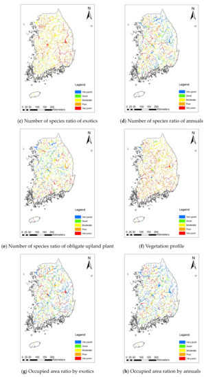 Figure 1. Nation-wide distribution of the grades based on each vegetation component and the riparian vegetation index of rivers in South Korea.