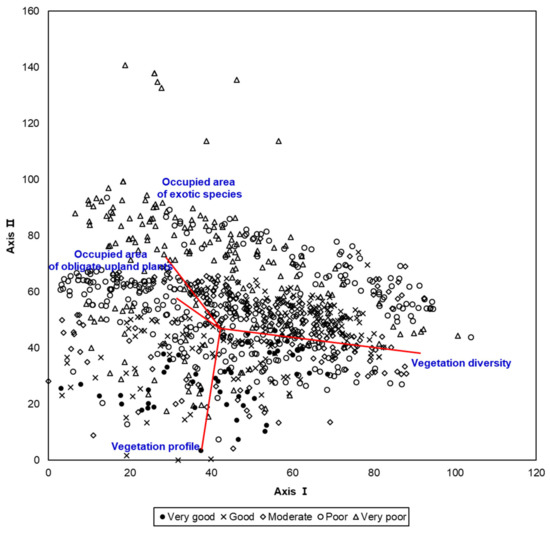 As the result of stand ordination based on score of each vegetation component, reaches evaluated as “very good” or “good” reaches tended to be arranged in the lower part, whereas the “very poor” or “poor” reaches were located in the upper part of Axis 2 (Figure 2). Community diversity, vegetation profile, occupied area of exotic plants, and occupied area of obligate upland plants dominated the arrangement of stands; the former two factors affected the distribution of “very good” or “good” reaches, whereas the latter two factors affected the distribution of “very poor” or “poor” reaches.