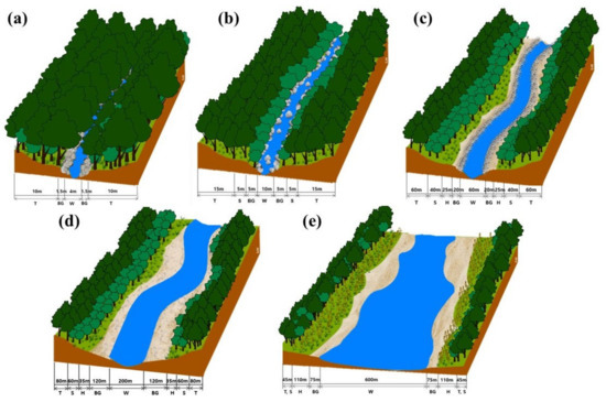 Figure 3. Spatial arrangement of riparian vegetation based on the reference information. Arrangement of landscape elements on the cross section of river appears in the order of bare ground, herb, shrub, and tree-dominated zones; zones reflecting flooding regime under the monsoon climate. Upper and lower valley streams, and downstream lack shrub and herb, herb, and shrub-dominated zones, respectively. This difference is determined by current speed due to the slope of riverbed. The breadth of each zone is a relative one and thereby it depends on the width of the waterway. Information on vegetation in each zone was suggested in Table 5. (a) upper valley stream, (b) lower valley stream, (c) upstream, (d) midstream, (e) downstream, W: waterway, BG: bare ground, H: herb dominated zone, S: shrub dominated zone, T: tree dominated zone.