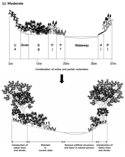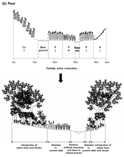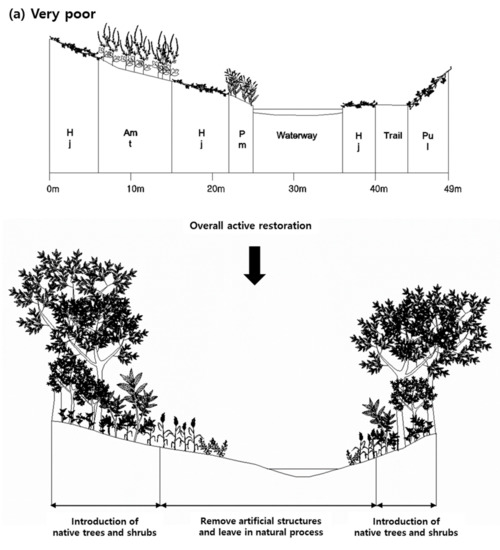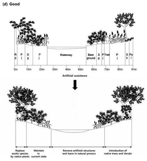 The levels of restoration determined based on the diagnostic evaluation results are listed in Table 6, and the restoration plans based on the grade are shown as diagrams in Figure 4. The lower the naturalness grade, the higher is the level of recommended restorative treatment. The restoration methods were based on various studies [41,76,77,78] related to ecological restoration, including “The SER International primer on ecological restoration” [63,64].