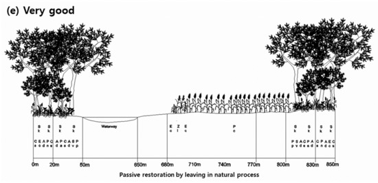 The ecological condition of river reaches evaluated as “very good” was relatively integrate, as the entire river range is covered with typical riparian vegetation with various plant species such as herbs, shrubs, and trees and complex stratification composed of tree, shrub, and herb layers. Thus, both community and species diversities are high, and the vertical structure expressed in the vegetation profile is equipped with diversity. Therefore, passive restoration, which is left to the natural process without any special treatment, is recommended here (Table 6 and Figure 3).