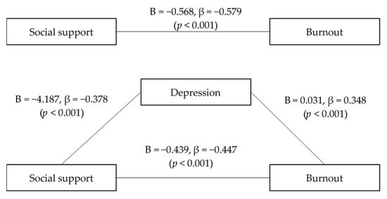 Mediation model of the effects of depression on the relationship between social support and burnout (Sobel’s test: Z = −3.589, p < 0.001).