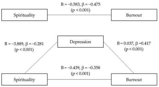 Mediation model of the effects of depression on the relationship between spirituality and burnout (Sobel’s test: Z = −3.092, p = 0.001).