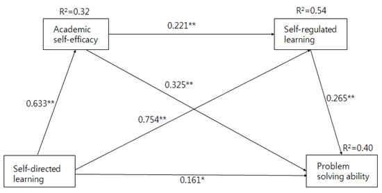 Results of the multiple mediation testing academic self-efficacy and self-regulated learning as mediators of the effect of self-directed learning on problem-solving ability. * p < 0.001. ** p < 0.05.