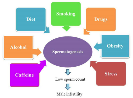 Among semen parameters, the assessment of sperm concentration is crucial in evaluating male reproductive potential for several reasons, including: (1) sperm count is importantly linked to male fertility and it is used as the first step in semen analysis towards the identification of factors behind male infertility [41,42]; (2) any decline in sperm count may be related to male reproductive problems [43]; (3) various semen parameters, including sperm count, have been associated with various environmental factors such as pesticides [44], endocrine disrupting chemicals [45], diet [46], stress [47] and smoking [48]. Therefore, sperm count may reflect the impact of the environment on male health and fertility [49]. Indeed, there is a strict association between lifestyle and male infertility (Figure 1), and available literature has confirmed the potential adverse effects of lifestyle on sperm production. Moreover, several factors induce an additive negative impact on spermatogenesis when exposed in combination with other environmental factors [50].
