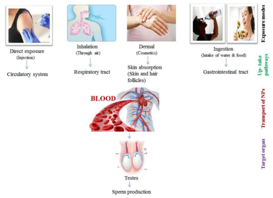 Overall, it is known that mononuclear phagocytic cells take up NPs, and in this way NPs enter cells [84]. Absorbance of NPs through dermal, ingestion and inhalation exposure enables nanoparticles to reach the circulatory system and then be translocated to many body tissues and organs, until their accumulation into the reproductive organs (Figure 2) [85], and even into the fetus [86].