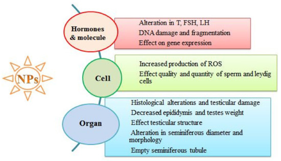 After entering the reproductive system, NPs may induce different deleterious effects at the reproductive organ, cell and hormone levels, as clearly depicted in Figure 3.