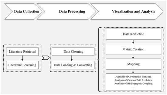 Bibliometrics is a technology used to investigate the development process and knowledge structure of a particular field of research [33]. Bibliometrics can be used to depict the overall picture of a particular research field at the macro level, and it can also be used to analyze hot topics at the micro level, so more and more scholars have applied it in their research [34,35]. With the support of mathematics and statistics, bibliometrics can be applied to the analysis of various literature samples such as books, periodicals, and policy texts [36,37]. The standard bibliometrics procedure consists of the steps of document collection, data processing, visualization, and analysis. Relying on the research of Li [27], Zupic [38], Aria [39], and other scholars in bibliometrics, we formulated our own research framework shown in Figure 1.