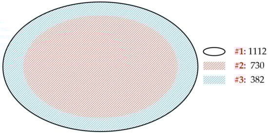 The search string “#1” returns those studies that match the search terms in titles, author keywords, KeyWords Plus, or abstracts, totaling 1112. The search string “#2” returns those studies that match the search terms in titles, author keywords, or KeyWords Plus, totaling 730. The search string “#3” returns those studies that match the search terms in abstracts but not in titles, author keywords, or KeyWords Plus, totaling 382. As shown in Figure 2, “#2” and “#3” constitute the entirety of “#1.”