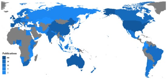 From 1999 to 2019, scholars from 80 countries or regions published papers related to energy poverty. Table 1 shows the number of published papers, the proportion of published papers, the number of citations, and the h-index of the top 20 most productive countries or regions. The data map in Figure 4 shows the numbers of published papers contributed by all countries or regions in the world. With 335 published papers, the UK is the country with the highest number of published papers. The UK and the USA account for almost half of the total number of publications, far exceeding other countries or regions combined. Governments in developed countries can provide more resources and data support to scholars to conduct research on energy poverty. That is why all five top countries are developed countries. With the development of the economy and the strengthening of civic awareness, scholars from developing countries, including China, South Africa, India, and Nigeria, have begun to analyze the phenomenon of energy poverty in their countries and they have been the most active in the field of energy poverty in recent years.