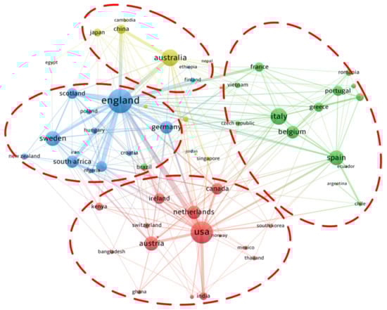 Figure 5 shows the cooperation relationship between countries or regions. The size of the node indicates the importance of a country in the whole network. The thickness of the line indicates the intensity of cooperation between two countries. Figure 5 shows that the cooperation network of countries can be divided into four clusters, and the UK, the USA, Australia, and Italy are at the core of each country cluster. The UK has established cooperative relations with almost all important regions and is the leader of the whole cooperative network. Most countries tend to cooperate with other countries in the same region. Due to similarities in geographical conditions, economy, and even culture, countries in the same region can use similar research paradigms, making it easier for them to establish cooperative relations.
