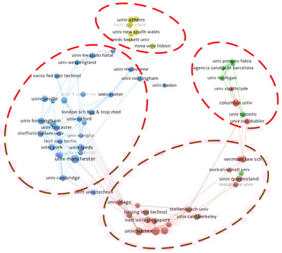 Compared to the international cooperation network, the density of the institutional cooperation network is lower, which is characterized by more clusters. Figure 6 shows that among the four institutional clusters there is only bilateral cooperation, and there has been no cooperation spanning across three clusters. The University of Sussex is most active in collaborating with other institutions, but most of its partners are institutions in the same country. Similar to the University of Sussex, most institutions also tend to establish cooperative relations with other domestic research institutions. The most representative are the cooperation groups led by the University of New South Wales, the University of Michigan, and the University of Birmingham. In the institutional cooperation network, a few nodes, such as the University of Nottingham, the University of Cape Town, the University of Toronto, and so on, play the role of “bridge,” connecting cooperation groups in different regions.