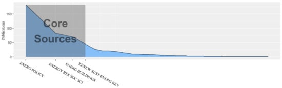 A total of 283 journals published papers related to energy poverty in the study period. Among the 20 most productive journals, Renewable and Sustainable Energy Reviews is the one with the highest impact factor, representing the highest level of energy poverty research to some extent. Energy Policy, Energy Research and Social Science, Energy Building, and Renewable and Sustainable Energy Reviews are the top four most productive journals by the number of published papers. As shown in Figure 7, the above four journals account for 37% of all published papers related to energy poverty, forming an essential part of energy poverty research, confirming Bradford’s law. Simply put, Bradford’s law is the embodiment of the Pareto effect with the following quantitative characterization: if journals in one field are divided into three parts by the number of papers, each part accounting for about one-third of all papers, then the journals in each part will be proportional to 1:n:n2, while the first part is usually defined as the core part.