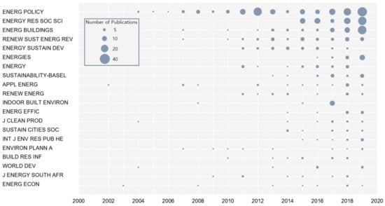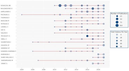 Figure 3 shows the overall trend of publications in energy poverty in the period 1999–2019. Blue and gray bars represent the annual number of total publications (TP) and total citations (TC), respectively. The red dots represent the mean total citation per year (MTCY).