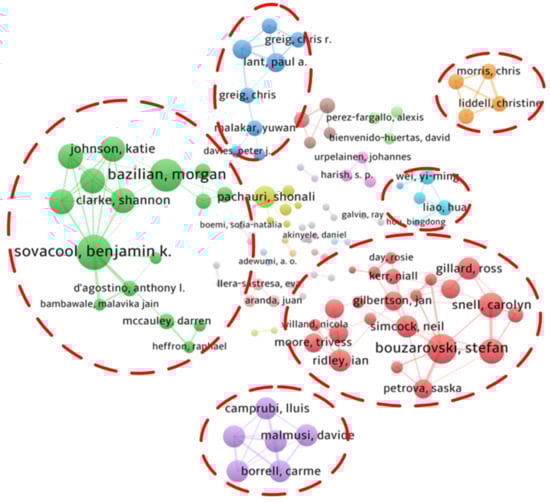 A total of 2253 authors have published papers in the field of energy poverty. Among published papers, 210 were written by single authors, while others were co-written by several authors. In general, each paper was completed by an average of three authors. Compared to international cooperation networks and institutional cooperation networks, the co-authorship networks shown in Figure 9 lack global connections. Apart from authors in the large-scale co-authorship networks represented by Sovacool and Bouzarovski, most authors exist in networks in the form of small co-authorship networks or isolated nodes. This shows that current academic cooperation between scholars dealing with energy poverty is inadequate and that the scholars do not fully share relevant knowledge and opinions.