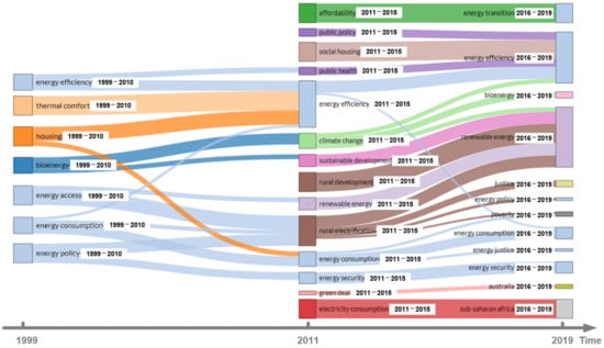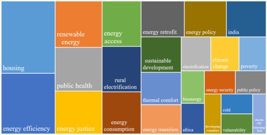 The tree map shown in Figure 11 contains words in the fields of energy, economy, health, construction, and even policy, indicating that energy poverty is an interdisciplinary topic. The word “housing” appears in nearly 10% of papers, which indicates that the main research object of energy poverty is residential houses. Furthermore, “energy efficiency” and “renewable energy” appear in 8% and 5% of the papers, respectively, which shows that scholars consider the improvement of energy efficiency and the use of renewable energy as two important solutions to energy poverty. The appearance of “public health” and “thermal comfort” indicates that the ultimate goal of energy poverty research is to improve the health and ensure well-being of the population. In addition, the fact that the word “energy justice” appears in 5% of papers indicates that some researchers in the field of energy poverty have drawn attention to ethical aspect of the problem.
