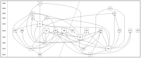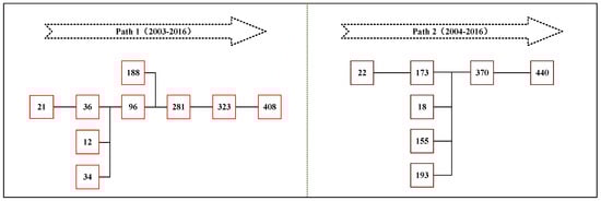 In this study, paper samples were sorted according to the number of citations, and citation paths of the 25 most cited papers were visualized using HistCite software. Figure 13 shows that the network begins with papers #12 [52] and #18 [53] and ends with papers #408 [54] and #440 [1]. Except for paper #197 [55] which is an isolated point, other papers entered the citation network from 2003 to 2016. The number of papers published in 2012 is higher than in any other year, which indicates that the research in that year has an important impact on the diffusion of knowledge throughout the field. Based on the network density and the importance of citations, the whole network can be divided into left and right parts. Therefore, the two most representative citation paths were identified as shown in Figure 14.