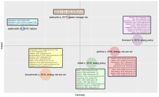 Both TC and MTCY show yearly fluctuations. In the early research stage, the concept of energy poverty and the research methodology were not mature. So, there were no high-quality or high-influence papers in some years. This explains the low TC and the drastic fluctuation of MTCY in the early papers. In 2003, MTCY reached the highest value of seven, which means that the papers published in that year have been cited by seven papers each year since then. This shows that the papers published in 2003 have a high influence, laying the foundations for the field of energy poverty. After 20 years of development, MTCY exhibited a steady development trend in 2018 and 2019, indicating that research on energy poverty has entered the maturity stage. Supported by a complete set of concepts and methodologies, scholars carried out research in a more or less predictable manner, which also had a limiting effect on the groundbreaking research.