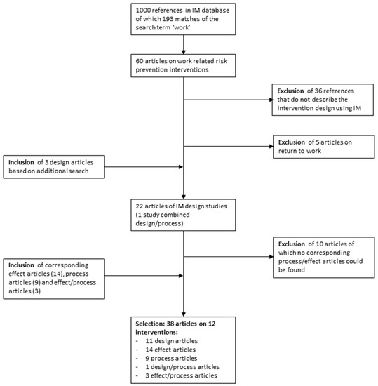 For each of the design articles included at this point, a search was carried out to find process and effect evaluation articles on the interventions as described in the design articles (by performing a search based on (co)authors names and the name of the intervention). The design articles for which a published process and effect evaluation could not be found were excluded (10 articles excluded). For each of the remaining design articles, the process and effect evaluation were included, resulting in a total of 38 articles (11 design articles, 14 effect articles, 9 process articles, 1 article combining the intervention design and the process evaluation, and 3 articles combining the effect and process evaluation) on 12 interventions.
