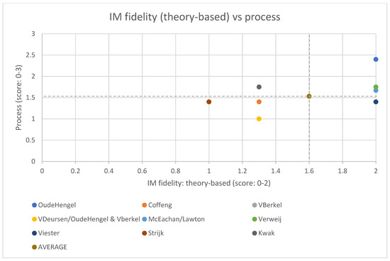 Scores of the fidelity of the theory-based approach (score: 0–2) and the implementation process (score: 0–3) per study (the dotted lines show the average scores for the IM fidelity (theory-based approach) and the implementation process). For three of the process evaluations, there was not enough data available to calculate a process score [25,50,54].