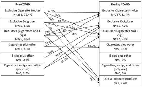 A figure was generated to describe overall changes in tobacco use from pre-COVID to during COVID. For this figure, participants were classified into groups based on the tobacco products that they reported using pre- and during COVID. Exclusive cigarette smokers were those who reported only use of cigarettes, while exclusive e-cigarette users were those who reported only use of e-cigarettes. Dual users were those who reported use of both cigarettes and e-cigarettes. Products other than cigarettes or e-cigarettes were classified in a category as other which included cigars, pipes, or chew.