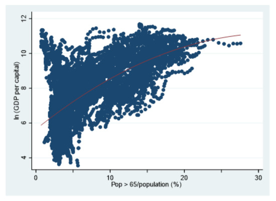 Summary statistics of the sample data are presented in Table 1. Table 2 presents pairwise correlation. Health investment and economic growth are positively correlated, which is consistent with the traditional human capital theory. Population aging and economic growth also present a positive relationship. Following Liu (2013) [26], this paper uses a scatter plot to observe the relationship between population aging and economic growth. Through the scatter plot, the relationship between population aging and economic growth can be intuitively seen. Figure 1 shows that aging population and economic growth present a tendency of positive correlation, but the positive relationship is gradually weakened. This is probably because, in the initial stage, the acceleration of physical capital accumulation and the extension of demographic dividend brought by population aging are conducive to economic growth, but, with the deepening of population aging, the positive relationship between population aging and economic growth gradually weakens and may even change.